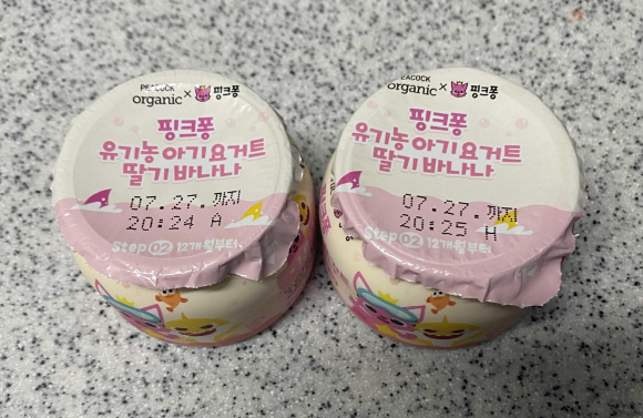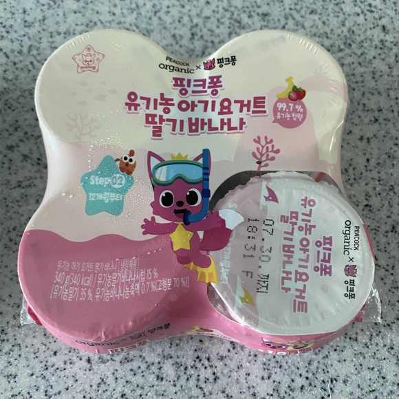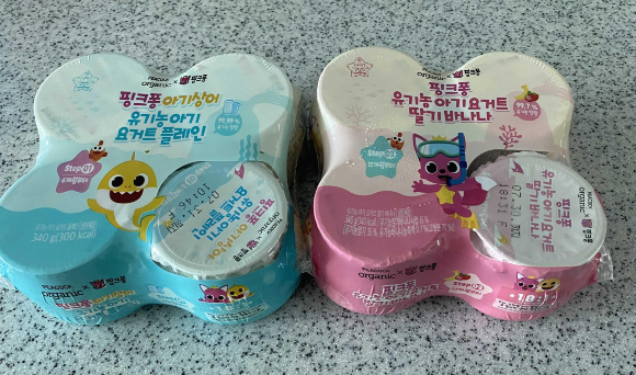 핑크퐁 캐릭터인 '핑크퐁 유기농 아기요거트 딸기바나나' 요거트는 12개월 이후부터 섭취를 추천드립니다.